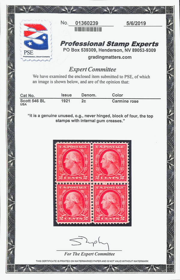 5320 nhbl 546 image1921, 2¢ carmine rose, type III, rotary press coil waste, perf. 11 (Scott 546), block of 4, o.g., never hinged (gum creases), Fine to Very Fine, with 2019 P.S.E. certificate.
