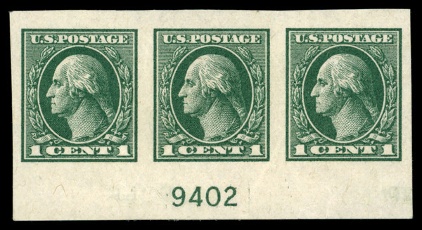 5306 nh 531 image1919, 1¢ green, offset printing, imperf. (Scott 531), strip of 3 with plate number, o.g., never hinged (minor gum crease), Very Fine to Extremely Fine.