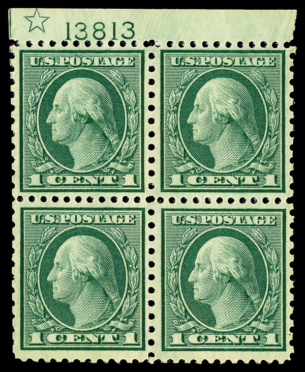 5315 nh/ogbl 538 image1919, 1¢ green, rotary press coil waste, perf. 11 x 10 (Scott 538), top plate block of 4 with star and plate number 13813, Fresh glowing quality overall, o.g., top right stamp lightly hinged (3 stamps never hinged), Fine to Very Fine.