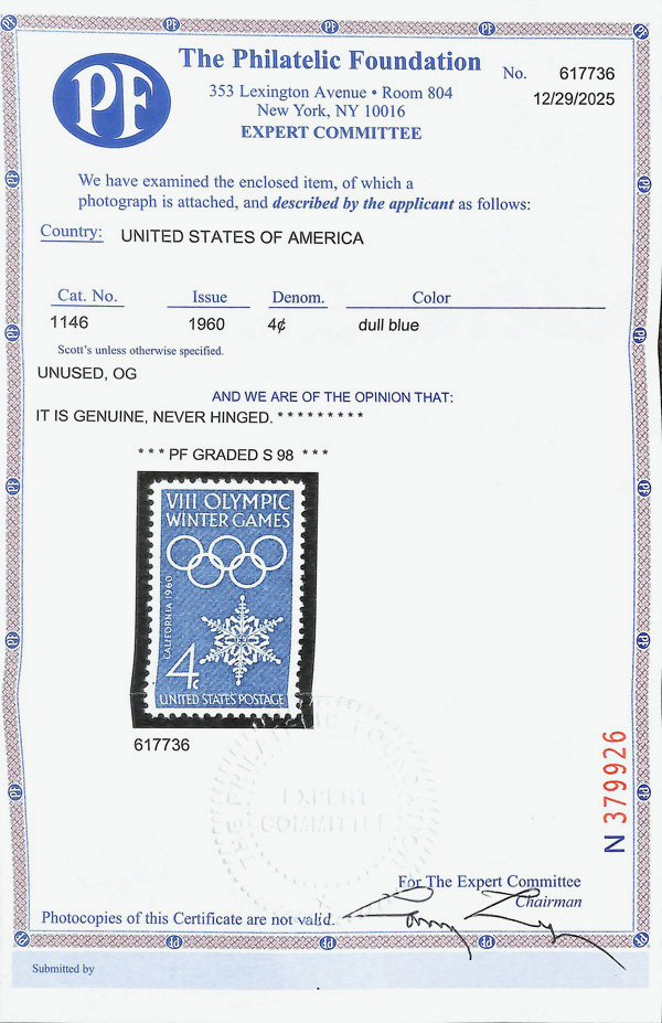 7383 nh 1146 image1960, 4¢ Winter Olympics (Scott 1146), o.g., never hinged, Superb, with 2025 P.F. certificate graded SUP 98.