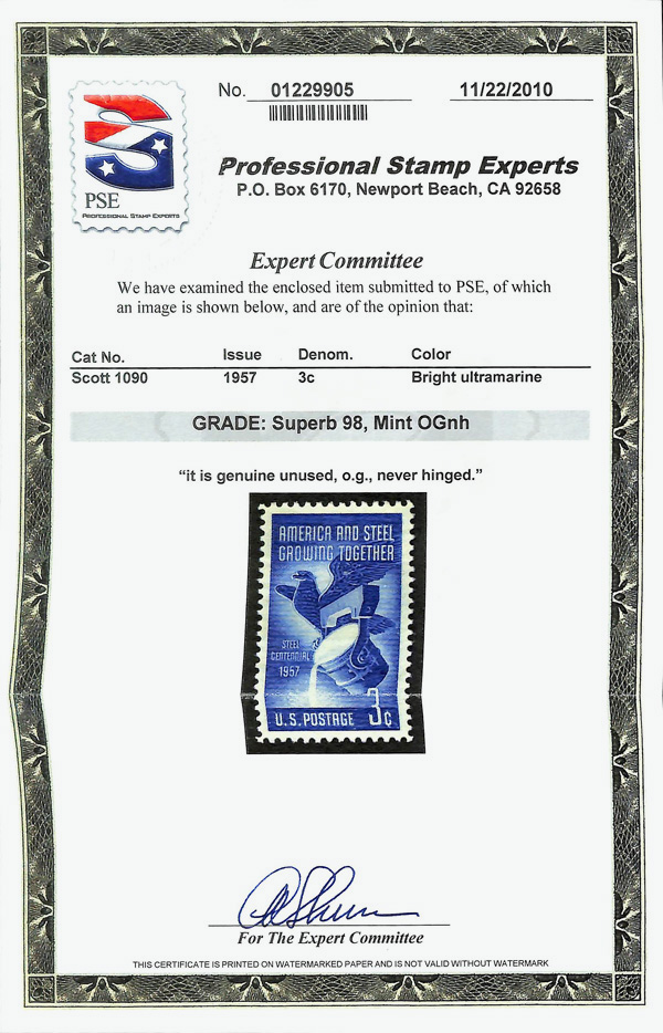 7369 nh 1090 image1957, 3¢ Steel Industry (Scott 1090), o.g., never hinged, Superb, with 2010 P.S.E. certificate graded SUP 98.