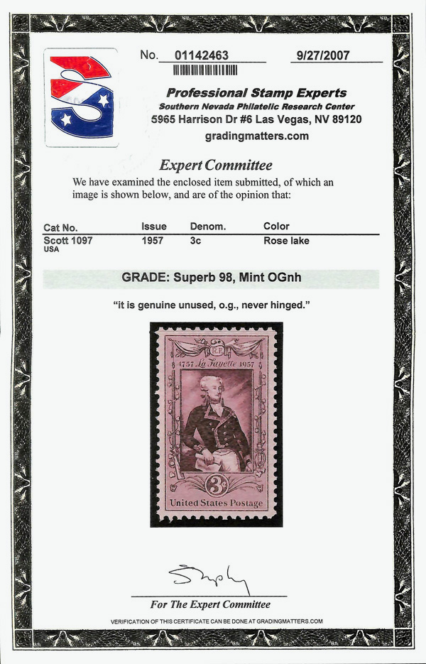 7372 nh 1097 image1957, 3¢ Lafayette (Scott 1097), o.g., never hinged, Superb, with 2007 P.S.E. certificate graded SUP 98.