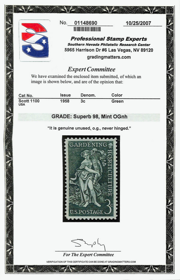 7374 nh 1100 image1958, 3¢ Gardening (Scott 1100), o.g., never hinged, Superb, with 2007 P.S.E. certificate graded SUP 98.