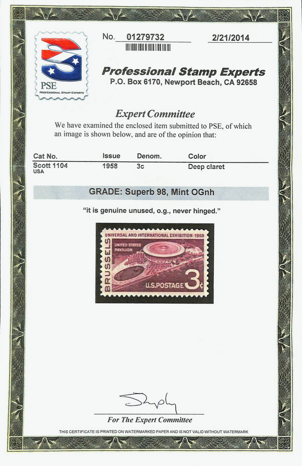 7375 nh 1104 image1958, 3¢ Brussels Exhibition (Scott 1104), o.g., never hinged, Superb, with 2014 P.S.E. certificate graded SUP 98.