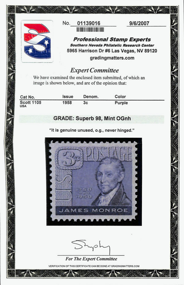 7376 nh 1105 image1958, 3¢ James Monroe (Scott 1105), o.g., never hinged, Superb, with 2007 P.S.E. certificate graded SUP 98.