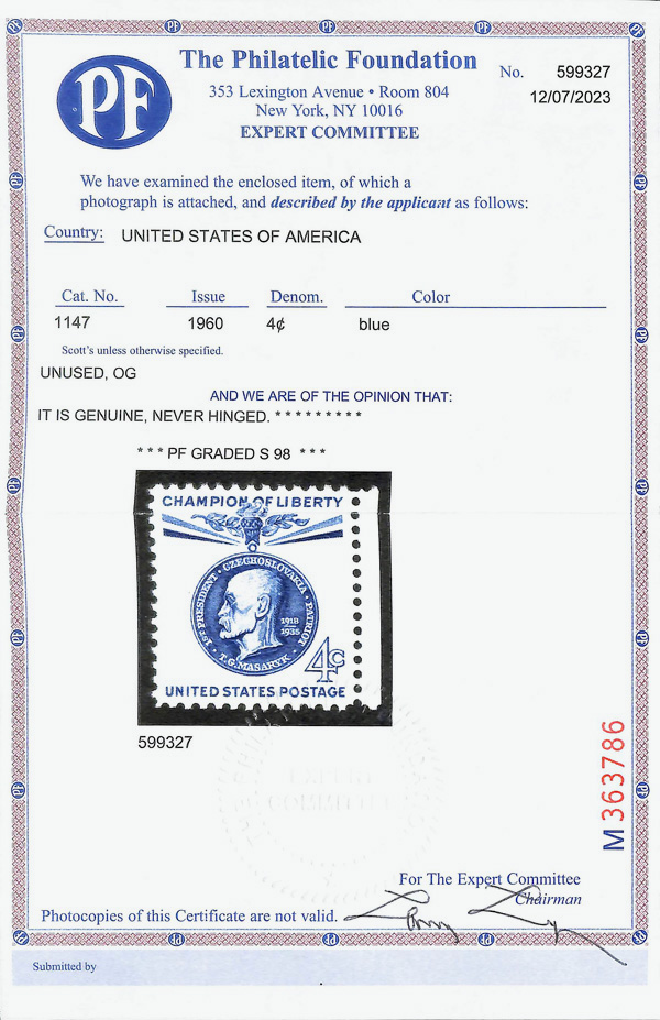 7384 nh 1147 image1960, 4¢ Champion of Liberty: Thomas Masaryk (Scott 1147), o.g., never hinged, Superb, with 2023 P.F. certificate graded SUP 98.