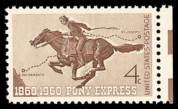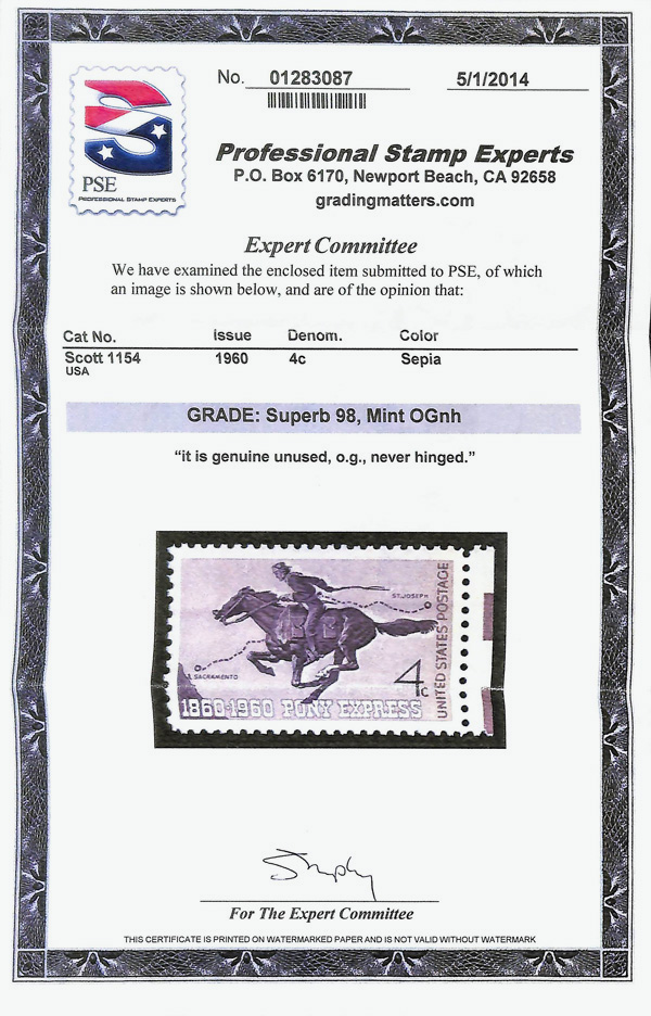 7386 nh 1154 image1960, 4¢ Pony Express (Scott 1154), o.g., never hinged, Superb, with 2014 P.S.E. certificate graded SUP 98.
