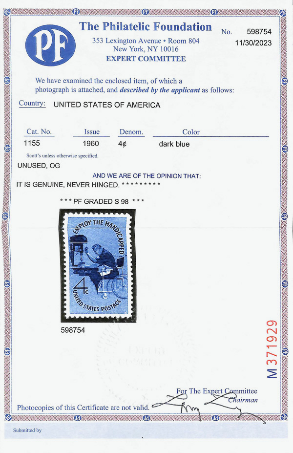 7387 nh 1155 image1960, 4¢ Employ the Handicapped (Scott 1155), o.g., never hinged, Superb, with 2023 P.F. certificate graded SUP 98.