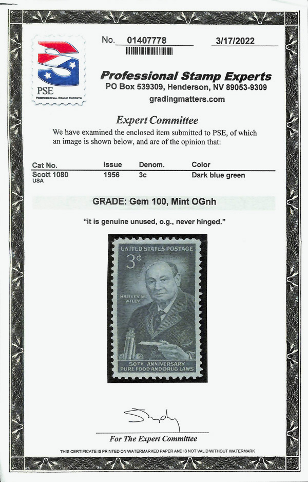 7362 nh 1080 image1956, 3¢ Pure Food & Drug Laws (Scott 1080), o.g., never hinged, Superb, with 2022 P.S.E. certificate graded GEM 100.