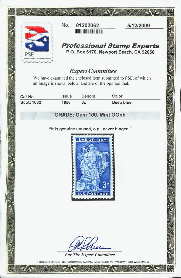 7364 nh 1082 image1956, 3¢ Labor Day (Scott 1082), o.g., never hinged, Superb, with 2009 P.S.E. certificate graded GEM 100.