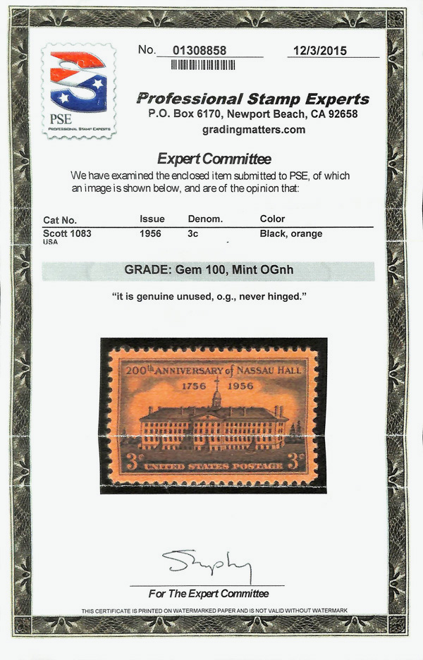 7365 nh 1083 image1956, 3¢ Nassau Hall (Scott 1083), o.g., never hinged, Superb, with 2015 P.S.E. certificate graded GEM 100.