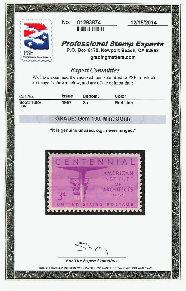 7368 nh 1089 image1957, 3¢ Architects (Scott 1089), o.g., never hinged, Superb, with 2014 P.S.E. certificate graded GEM 100.