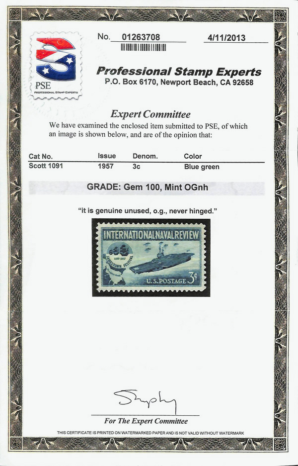 7370 nh 1091 image1957, 3¢ International Naval Review (Scott 1091), o.g., never hinged, Superb, with 2013 P.S.E. certificate graded GEM 100.
