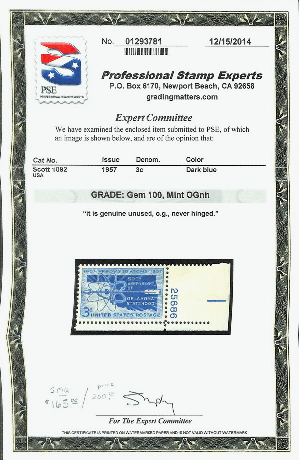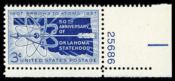 7371 nh 1092 image1957, 3¢ Oklahoma Statehood (Scott 1092), plate number single, o.g., never hinged, Superb, with 2014 P.S.E. certificate graded GEM 100.