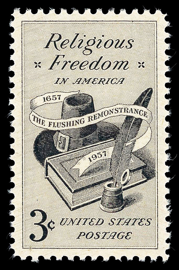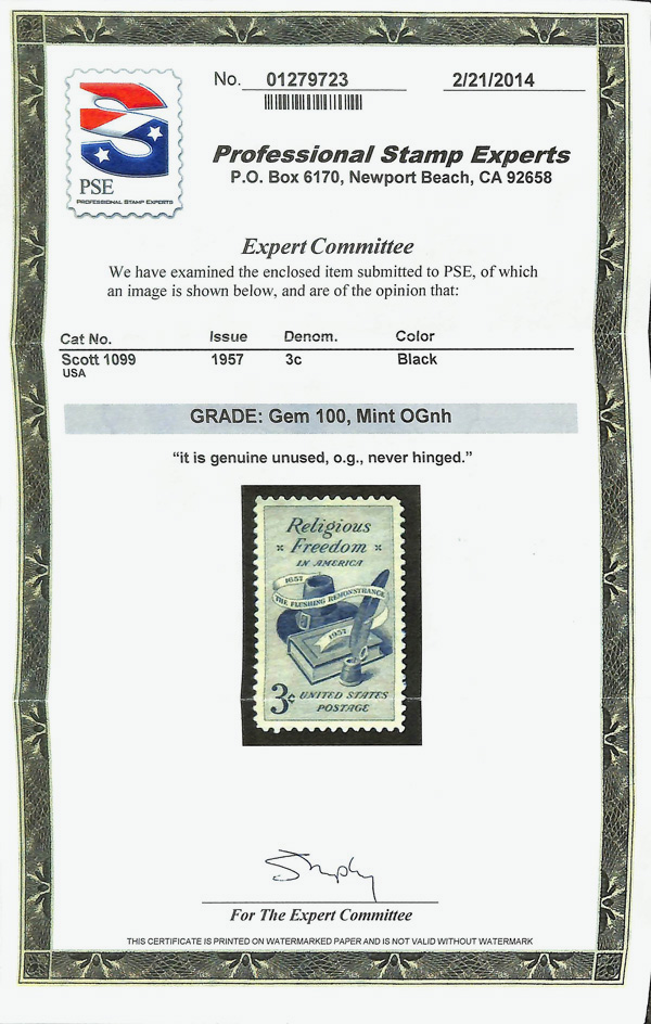 7373 nh 1099 image1957, 3¢ Religious Freedom (Scott 1099), o.g., never hinged, Superb, with 2014 P.S.E. certificate graded GEM 100.