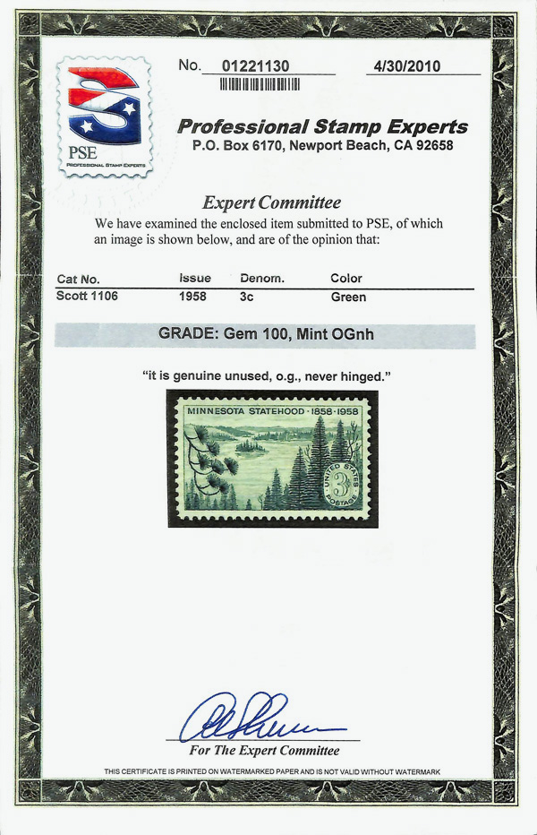 7377 nh 1106 image1958, 3¢ Minnesota Statehood (Scott 1106), o.g., never hinged, Superb, with 2010 P.S.E. certificate graded GEM 100.