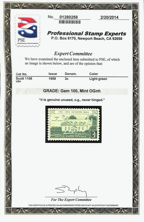 7378 nh 1108 image1958, 3¢ Gunston Hall (Scott 1108), o.g., never hinged, Superb, with 2014 P.S.E. certificate graded GEM 100.