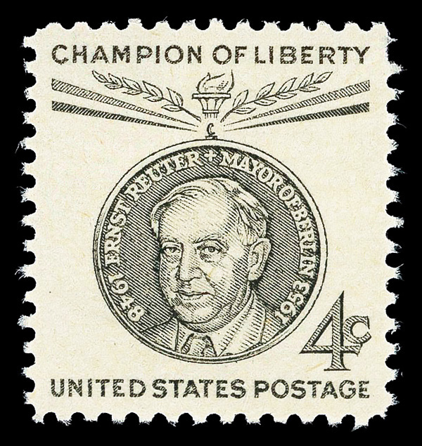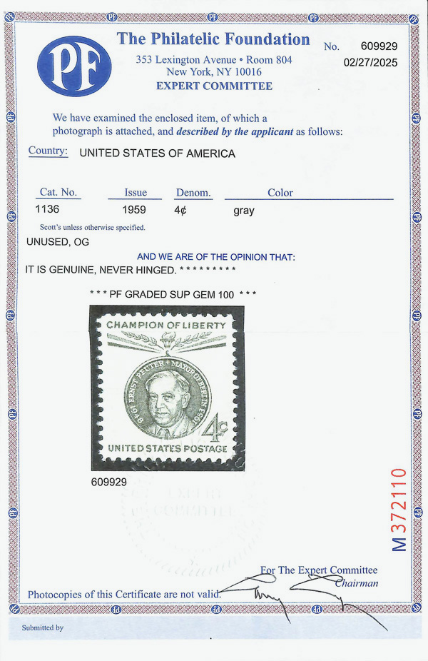 7382 nh 1136 image1959, 4¢ Champion of Liberty: Ernst Reuter (Scott 1136), o.g., never hinged, Superb, with 2025 P.F. certificate graded GEM 100.