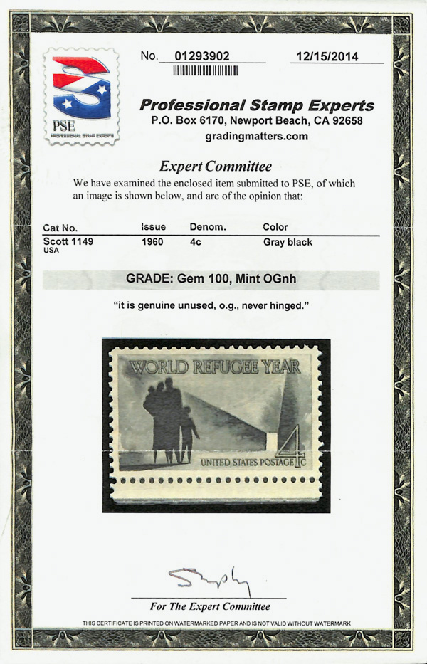 7385 nh 1149 image1960, 4¢ World Refugee Year (Scott 1149), o.g., never hinged, Superb, with 2014 P.S.E. certificate graded GEM 100.