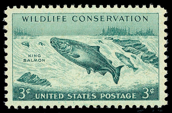 7361 nh 1079 image1956, 3¢ Wildlife Conservation: Salmon (Scott 1079), o.g., never hinged, Superb, with 2025 P.S.E. certificate graded GEM 100.