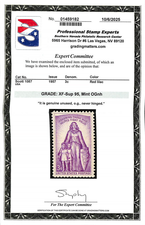 7367 nh 1087 image1957, 3¢ Polio (Scott 1087), o.g., never hinged, Extremely Fine to Superb, with 2025 P.S.E. certificate graded XF-SUP 95.