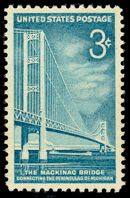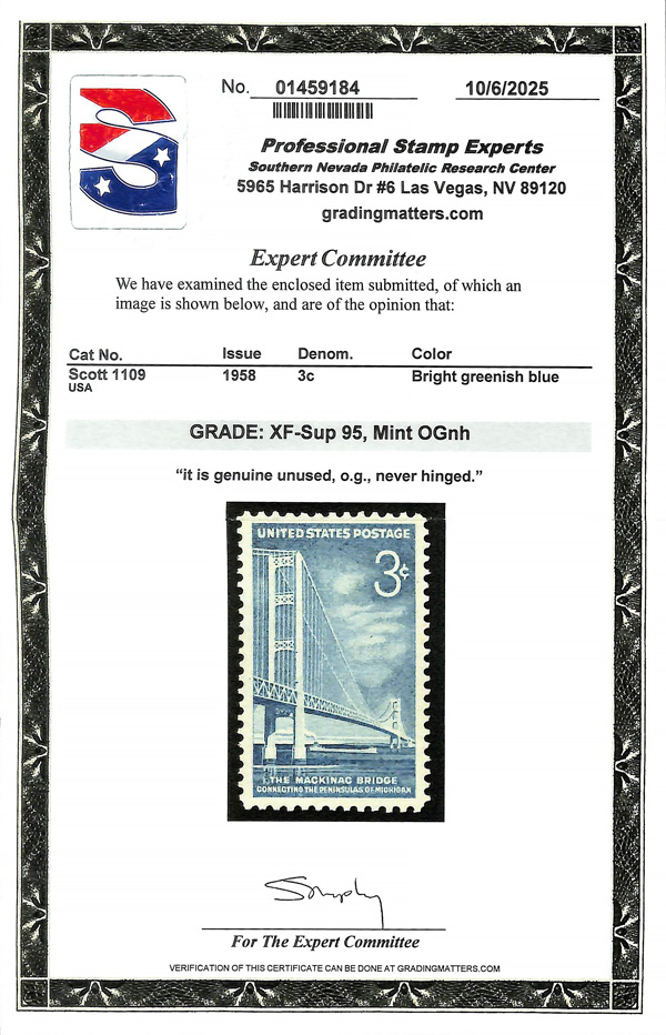 7379 nh 1109 image1958, 3¢ Mackinac Bridge (Scott 1109), o.g., never hinged, Extremely Fine to Superb, with 2025 P.S.E. certificate graded XF-SUP 95.