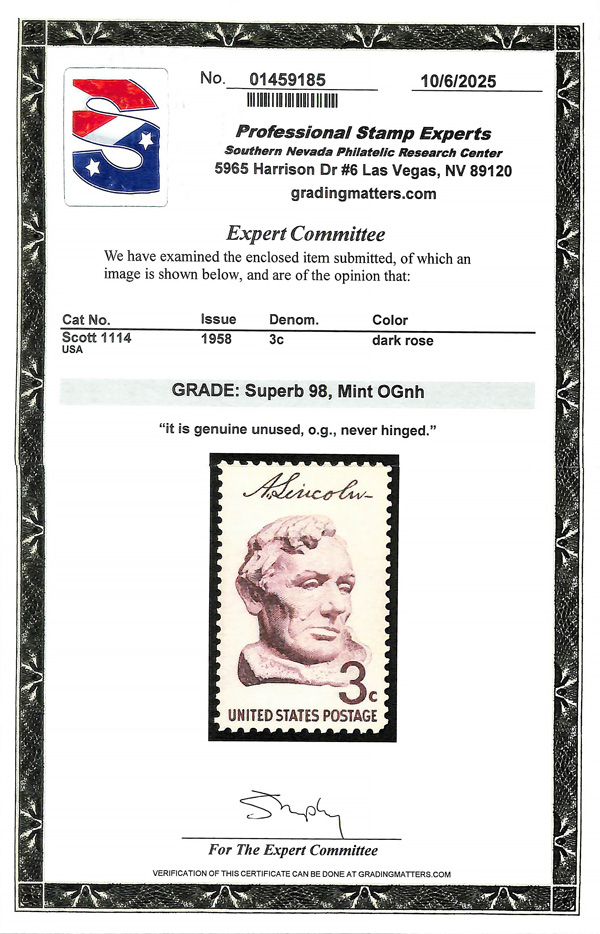 7380 nh 1114 image1959, 3¢ Lincoln (Scott 1114), o.g., never hinged, Superb, with 2025 P.S.E. certificate graded SUP 98.