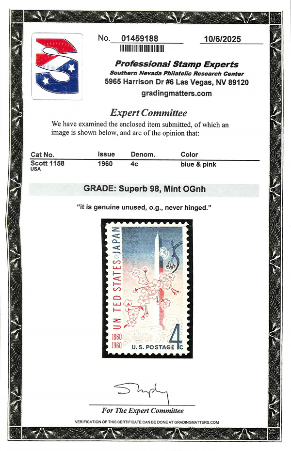 7388 nh 1158 image1960, 4¢ US-Japan Treaty (Scott 1158), o.g., never hinged, Superb, with 2025 P.S.E. certificate graded SUP 98.
