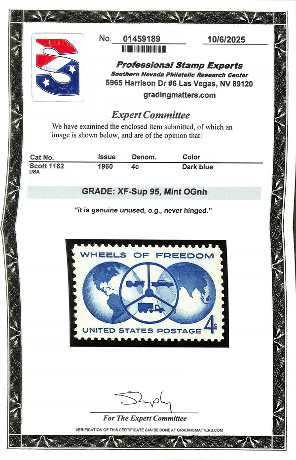 7390 nh 1162 image1960, 4¢ Wheels of Freedom (Scott 1162), o.g., never hinged, Extremely Fine to Superb, with 2025 P.S.E. certificate graded XF-SUP 95.