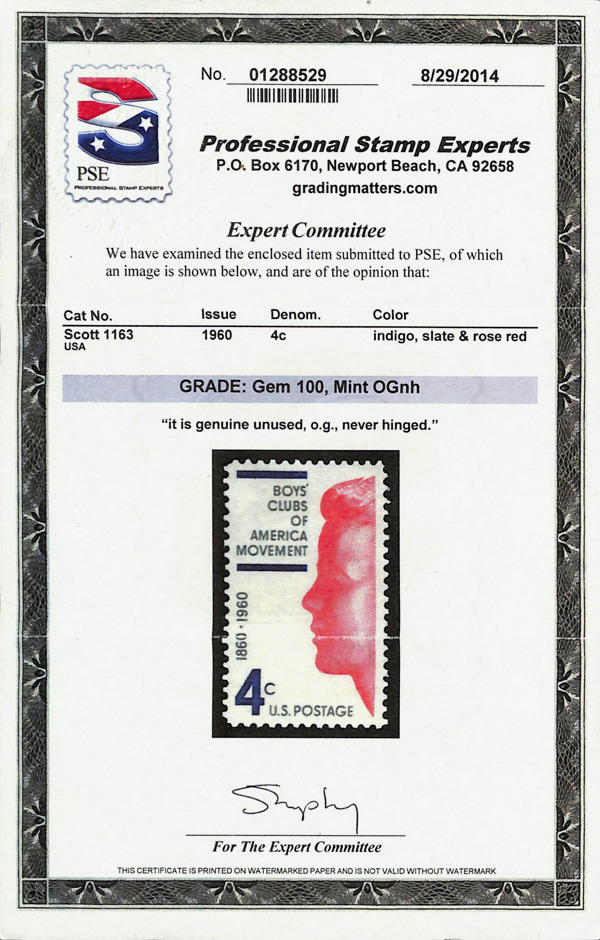 7391 nh 1163 image1960, 4¢ Boy's Clubs of America (Scott 1163), o.g., never hinged, Superb, with 2014 P.S.E. certificate graded GEM 100.