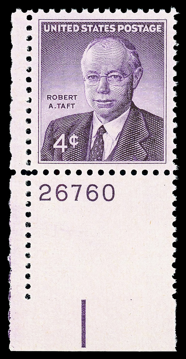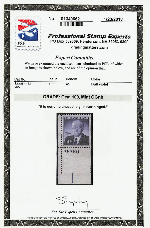 7389 nh 1161 image1960, 4¢ Robert Taft (Scott 1161), plate number single, o.g., never hinged, Superb, with 2018 P.S.E. certificate graded GEM 100.