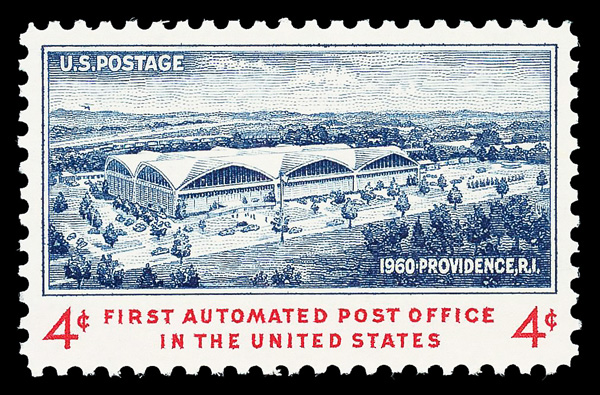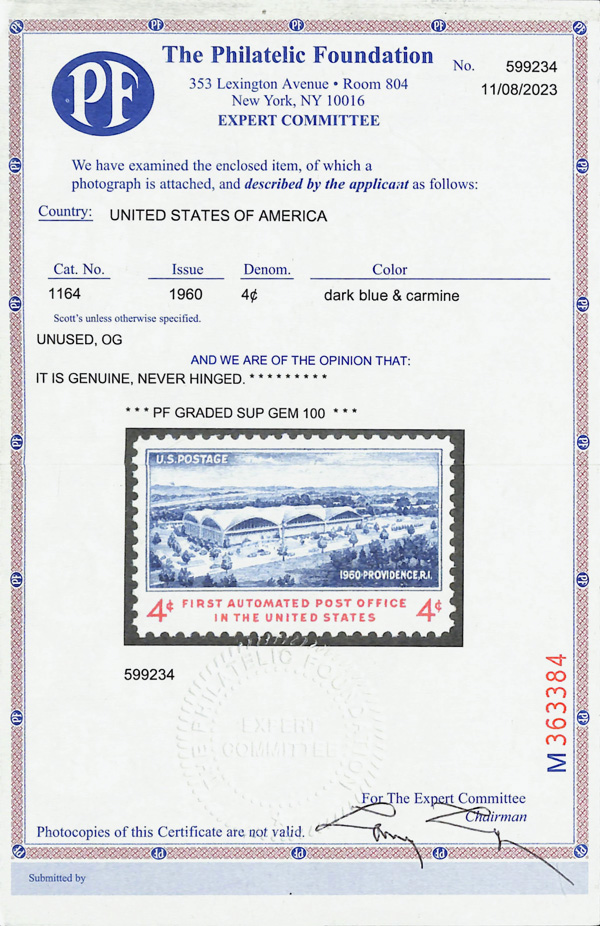 7392 nh 1164 image1960, 4¢ First Automated Post Office (Scott 1164), o.g., never hinged, Superb, with 2023 P.F. certificate graded GEM 100.