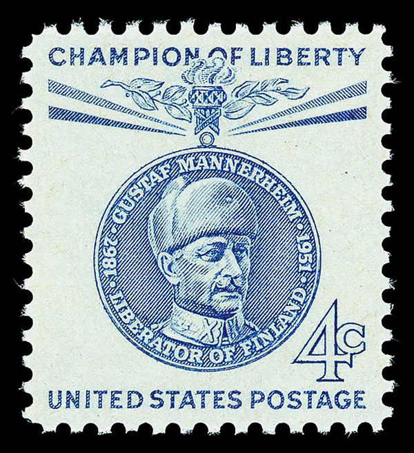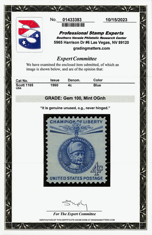 7393 nh 1165 image1960, 4¢ Champion of Liberty: Gustaf Mannerheim (Scott 1165), o.g., never hinged, Superb, with 2023 P.S.E. certificate graded GEM 100.