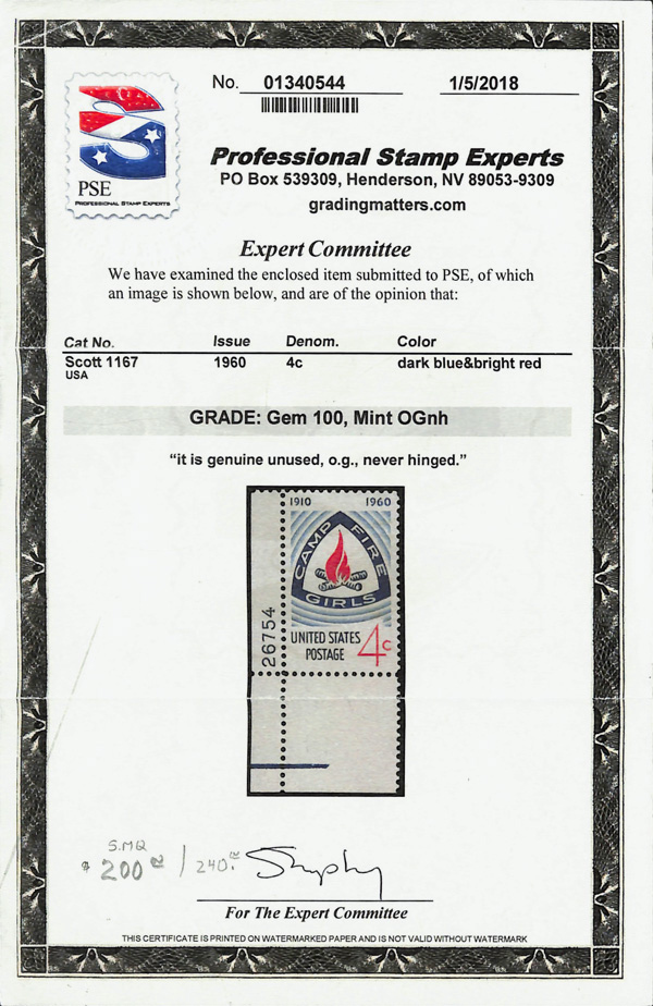 7394 nh 1167 image1960, 8¢ Camp Fire Girls (Scott 1167), o.g., never hinged, Superb, with 2018 P.S.E. certificate graded GEM 100.