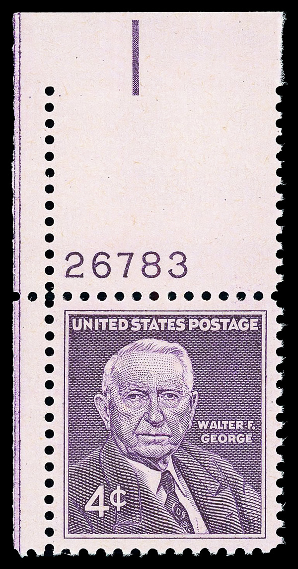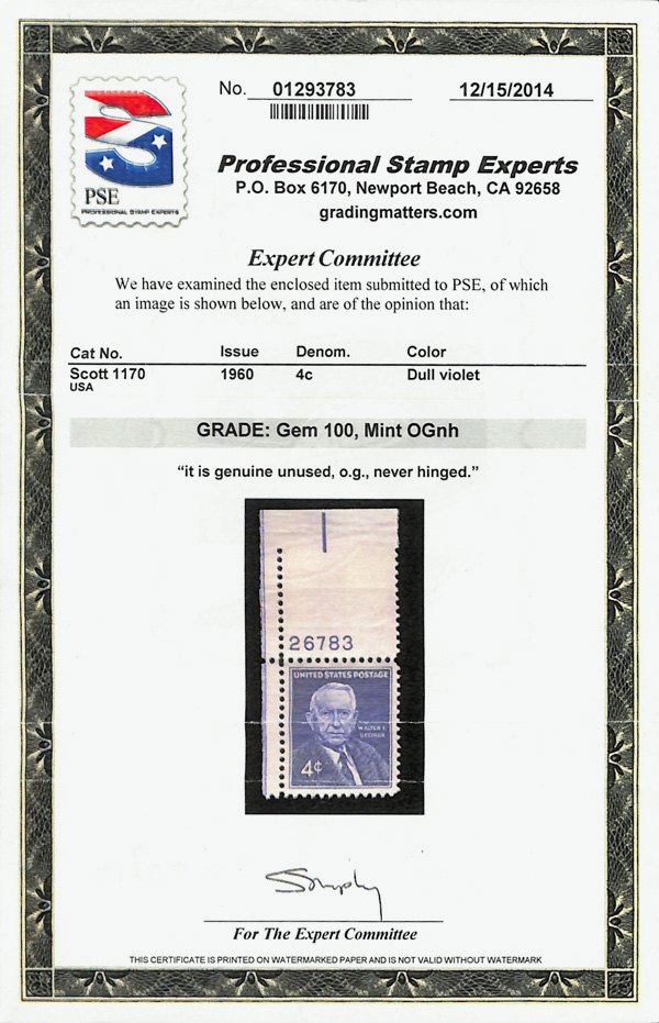7396 nh 1170 image1960, 4¢ Walter George (Scott 1170), plate number single, o.g., never hinged, Superb, with 2014 P.S.E. certificate graded GEM 100.