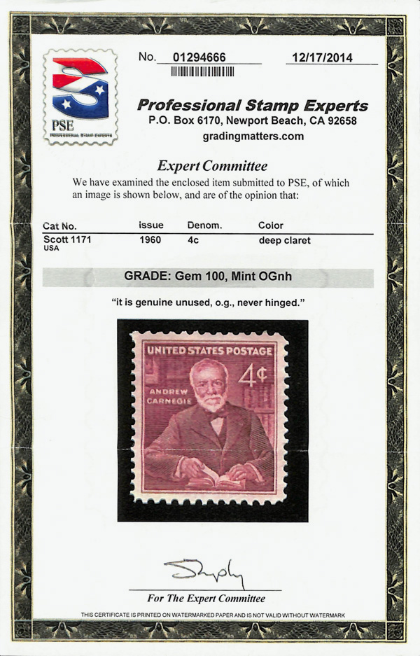 7397 nh 1171 image1960, 4¢ Andrew Carnegie (Scott 1171), o.g., never hinged, Superb, with 2014 P.S.E. certificate graded GEM 100.