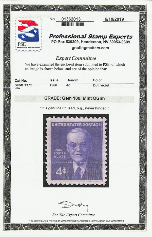 7398 nh 1172 image1960, 4¢ John Foster Dulles (Scott 1172), o.g., never hinged, Superb, with 2019 P.S.E. certificate graded GEM 100.