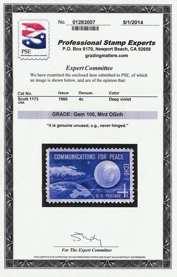 7399 nh 1173 image1960, 4¢ Echo I (Scott 1173), o.g., never hinged, Superb, with 2014 P.S.E. certificate graded GEM 100.