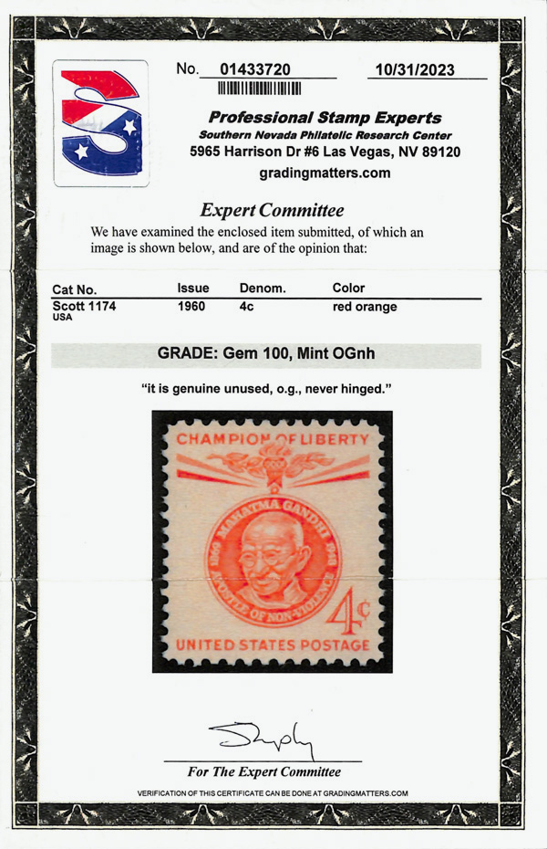 7400 nh 1174 image1961, 4¢ Champion of Liberty: Mahatma Gandhi (Scott 1174), o.g., never hinged, Superb, with 2023 P.S.E. certificate graded GEM 100.
