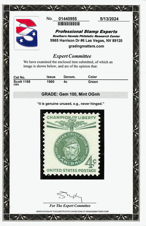 7395 nh 1168 image1960, 4¢ Champion of Liberty: Giuseppe Garibaldi (Scott 1168), o.g., never hinged, Superb, with 2024 P.S.E. certificate graded GEM 100.
