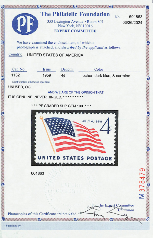 7381 nh 1132 image1959, 4¢ 49-Star Flag (Scott 1132), o.g., never hinged, Superb, with 2024 P.F. certificate graded GEM 100.
