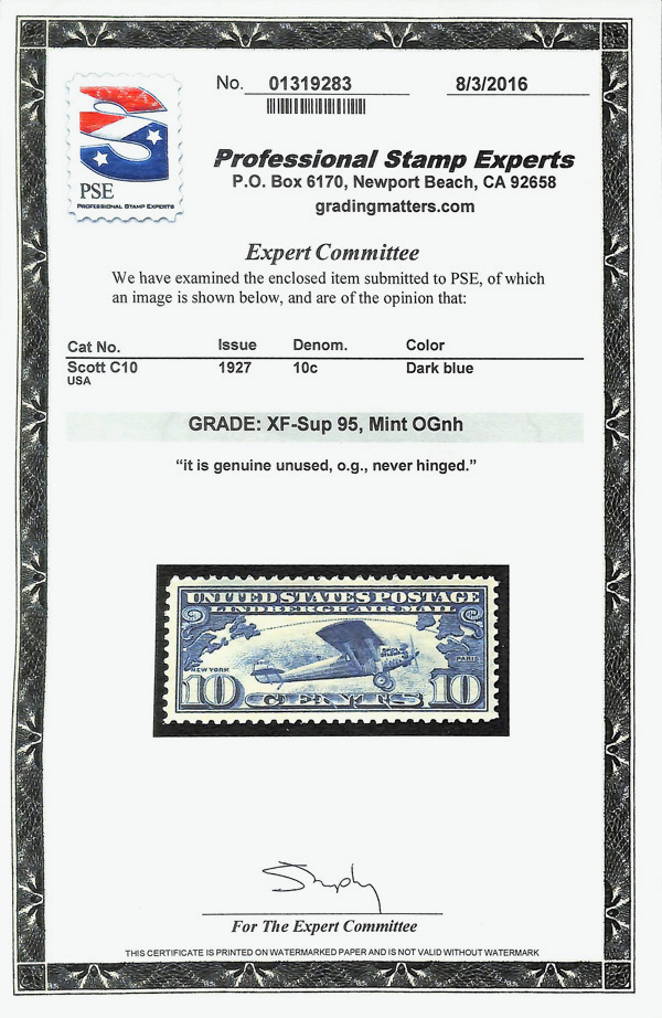 7559 nh C10 imageAirmail, 1927, 10¢ Lindbergh (Scott C10), Bright, crisp color, o.g., never hinged, Extremely Fine to Superb, with 2016 P.S.E. certificate graded XF-SUP 95.