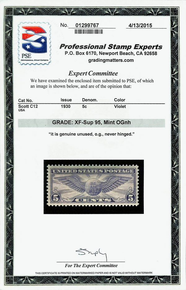 7560 nh C12 imageAirmail, 1930, 5¢ Winged Globe, flat plate printing (Scott C12), Clean color clarity, o.g., never hinged, Extremely Fine to Superb, with 2015 P.S.E. certificate graded XF-SUP 95.