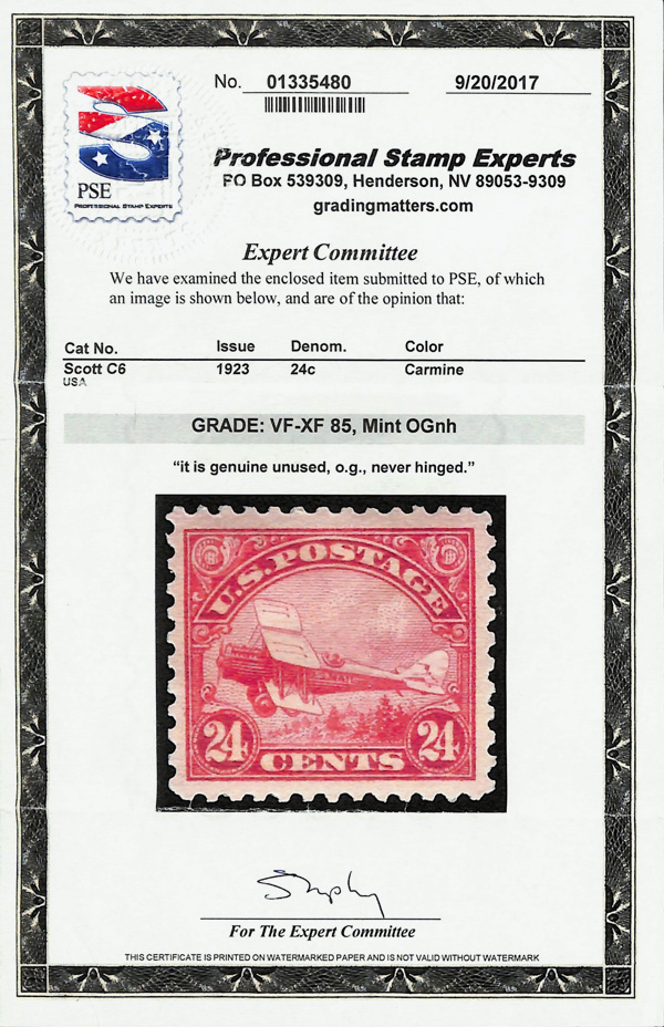 7552 nh C6 imageAirmail, 1923, 24¢ carmine (Scott C6), o.g., never hinged, Very Fine to Extremely Fine, with 2017 P.S.E. certificate graded VF-XF 85.
