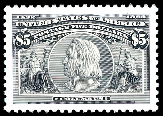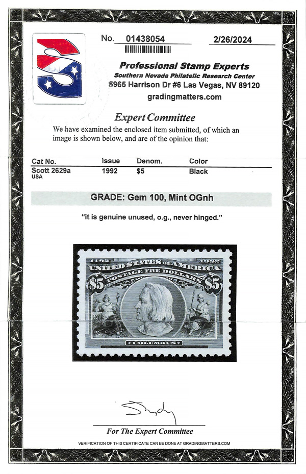 7536 nh 2629a image1992, $5 Voyages of Columbus, single from souvenir sheet (Scott 2629a), o.g., never hinged, Superb no SMQ price, with 2024 P.S.E. certificate graded GEM 100. (Image) (Image2) (All Images)