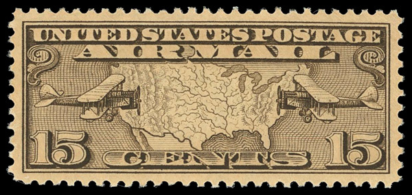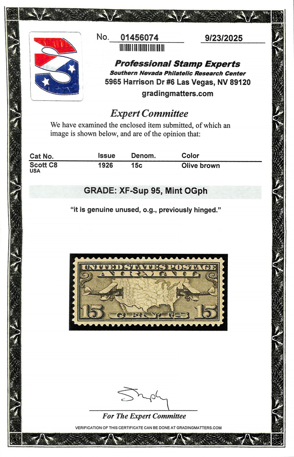 7557 og C8 imageAirmail, 1926, 15¢ Map & Planes (Scott C8), o.g., barest trace of hinge (appears never hinged), Extremely Fine to Superb, with 2025 P.S.E. certificate graded XF-SUP 95.