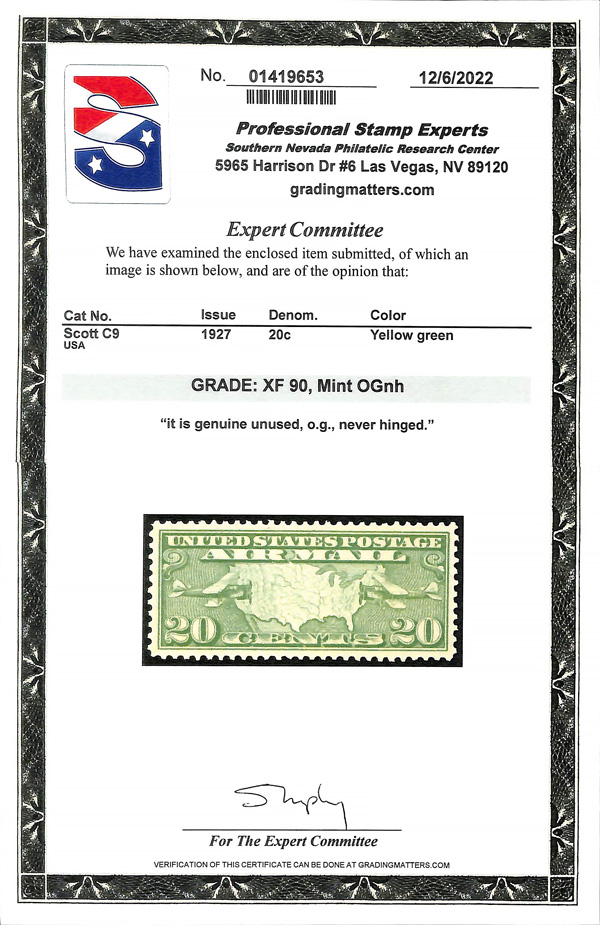 7558 nh C9 imageAirmail, 1927, 20¢ Map & Planes (Scott C9), o.g., never hinged, Extremely Fine, with 2022 P.S.E. certificate graded XF 90.