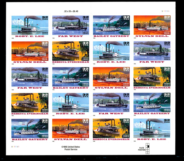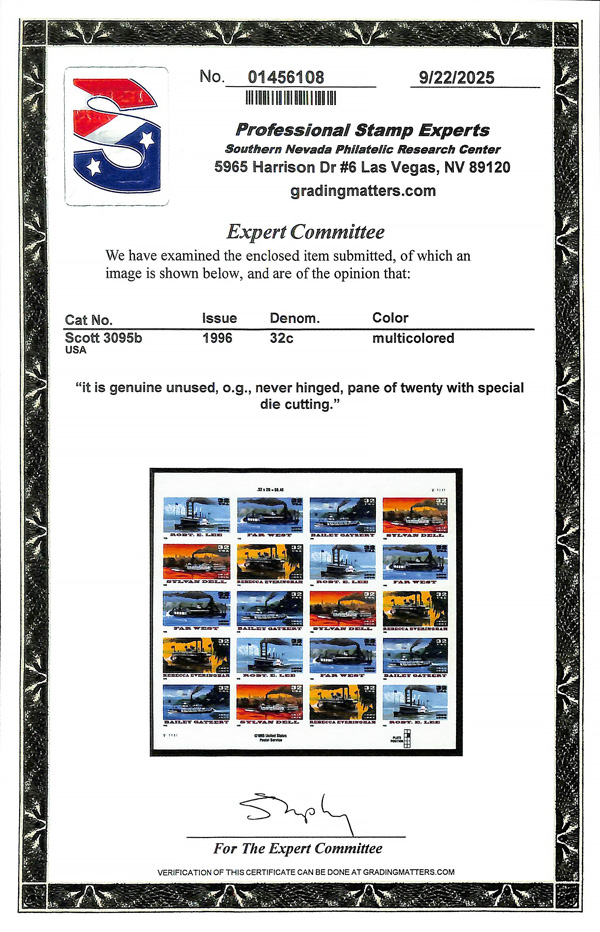 7537 nhbl 3095b image1996, 32¢ Riverboats, se-tenant, special die cutting (Scott 3095b), pane of 20, o.g., never hinged, Extremely Fine, with 2025 P.S.E. certificate.
