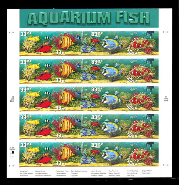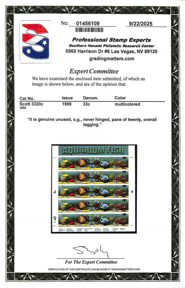 7546 nhbl 3320c image1999, 33¢ Aquarium Fish, overall tagging, se-tenant (Scott 3320c), pane of 20, o.g., never hinged, Extremely Fine, with 2025 P.S.E. certificate.