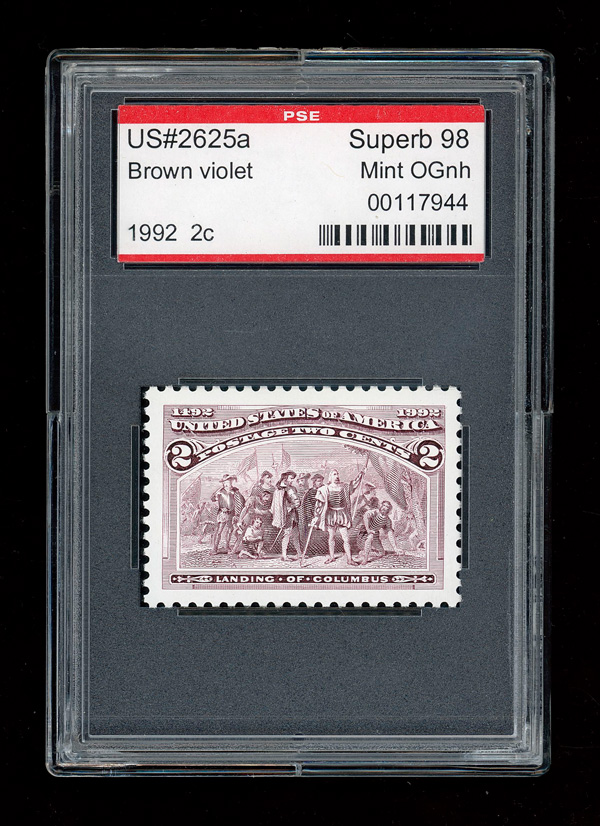 7522 nh 2625a image1992, 2¢ Voyages of Columbus, single from souvenir sheet (Scott 2625a), o.g., never hinged, Superb, with P.S.E. encapsulated certificate graded SUP 98.
